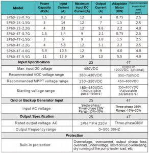 SP series solar pump inverter adopts MPPT(Maximum Power Point Tracking)and excellent motor drive technology to maximize the power output from solar panels. SP series inverters are compatible with both AC and DC input, and the AC output can be used for various kinds of normal AC pumps. When the solar power is not available, or the sunshine is not strong enough to drive the pump, the inverter could be automatic switched to single phase or three-phase AC input power, such as generator, or grid power. The system does not carry storage devices such as batteries. Therefore, it is recommended to pump water to the reservoir for future use, mainly used for water supply in remote areas without power supply or unstable power supply.
